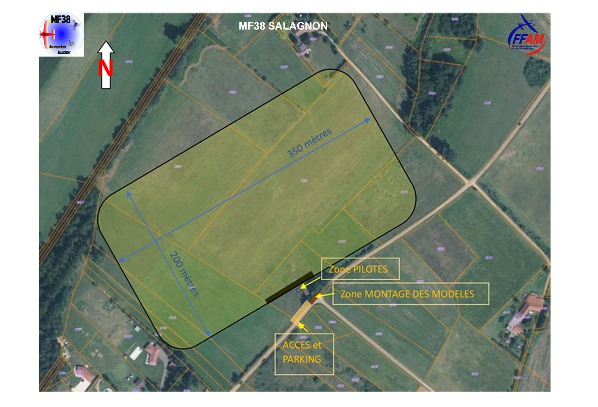 Voici le schéma de notre site où l'on peut voir le Chemin des Champagnes avec l'entrée et la zone parking en jaune, à droite de l'entrée les tables de montage en rouge et plus en avant à proximité de la piste la zone réservée aux pilotes en gris.